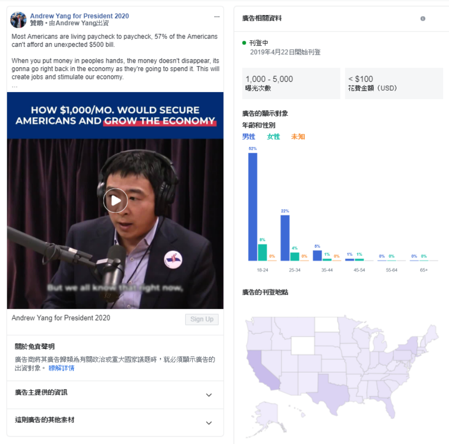 自今年1月逐步上線,3月底臉書「廣告檔案庫」已達到全球性規模,這是一個供所有人搜尋的公開資料庫,裡面包含所有出現在臉書和Instagram上的政治廣告,同時提供相關資訊,例如廣告金額、廣告費由誰支付、觸及率和目標觀眾的年齡、性別及地區等等。