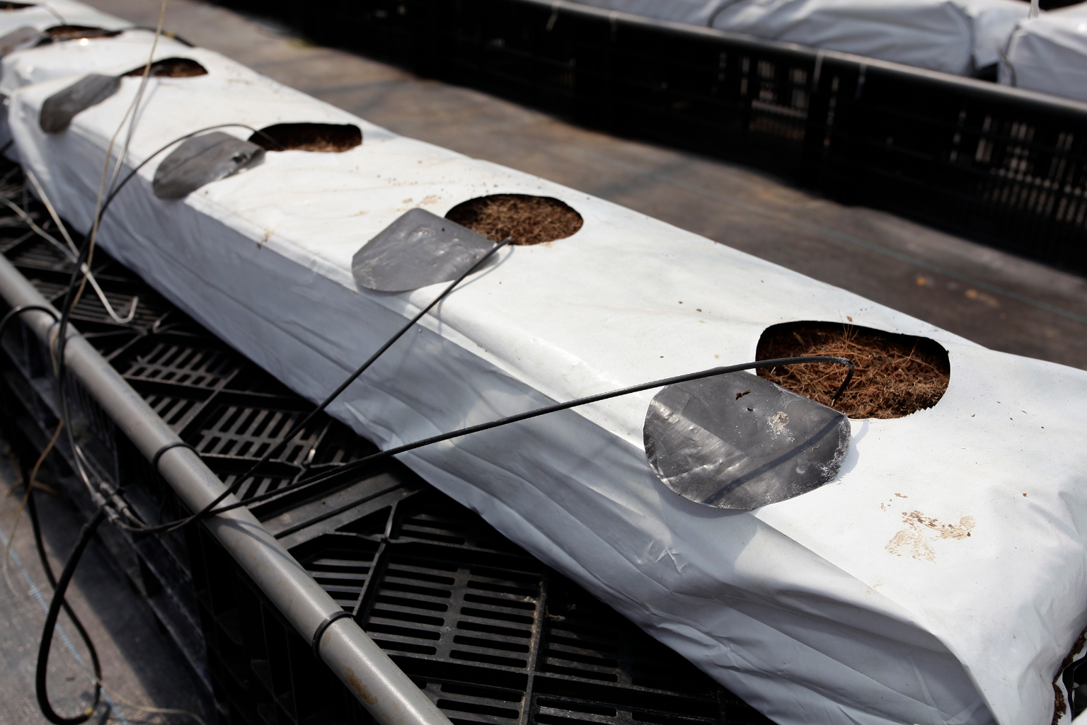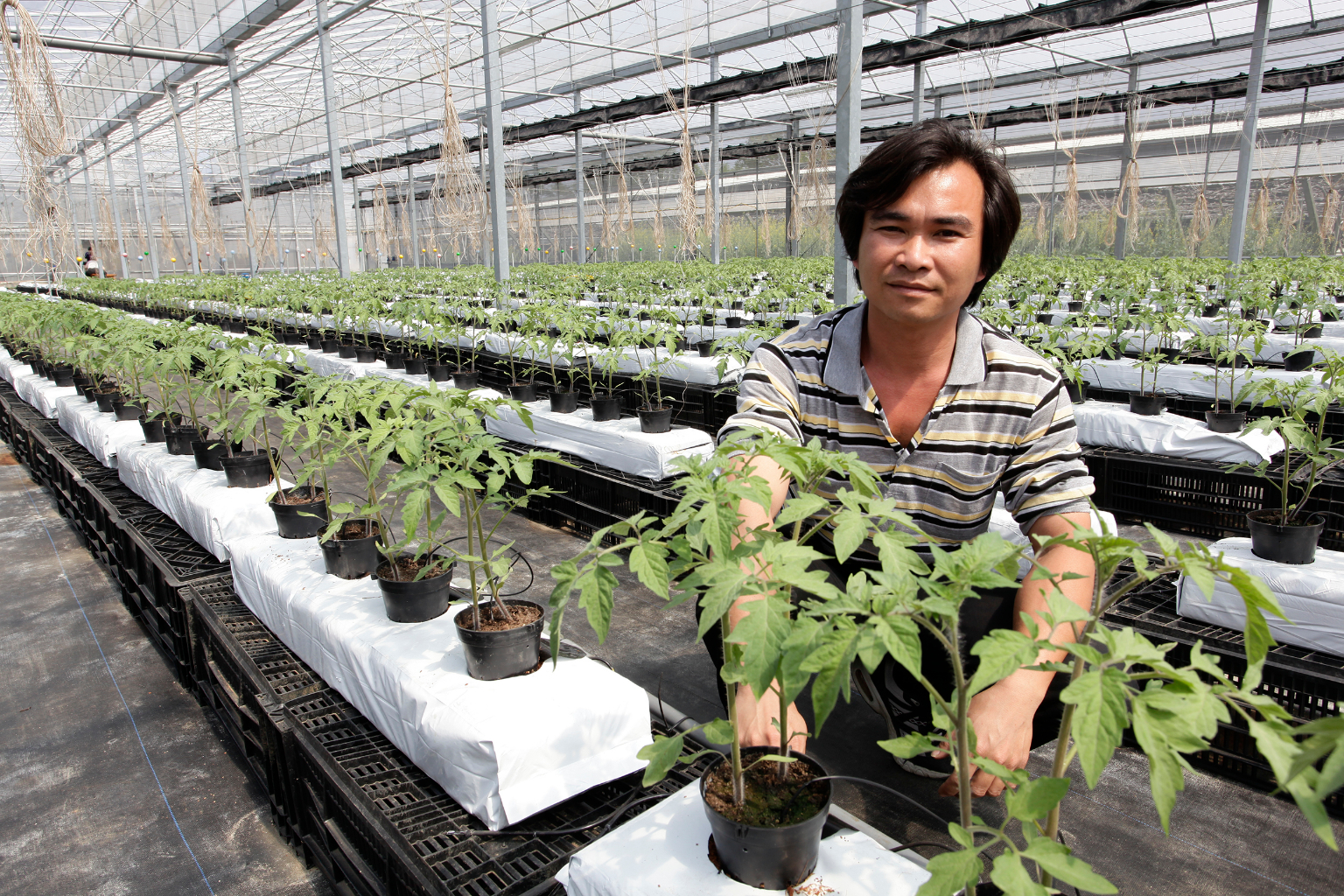 進新社直擊彭光鴻全家總動員,趕工番茄苗植盆作業,溫室中熱對流設計,讓我感受到徐徐微風吹動。