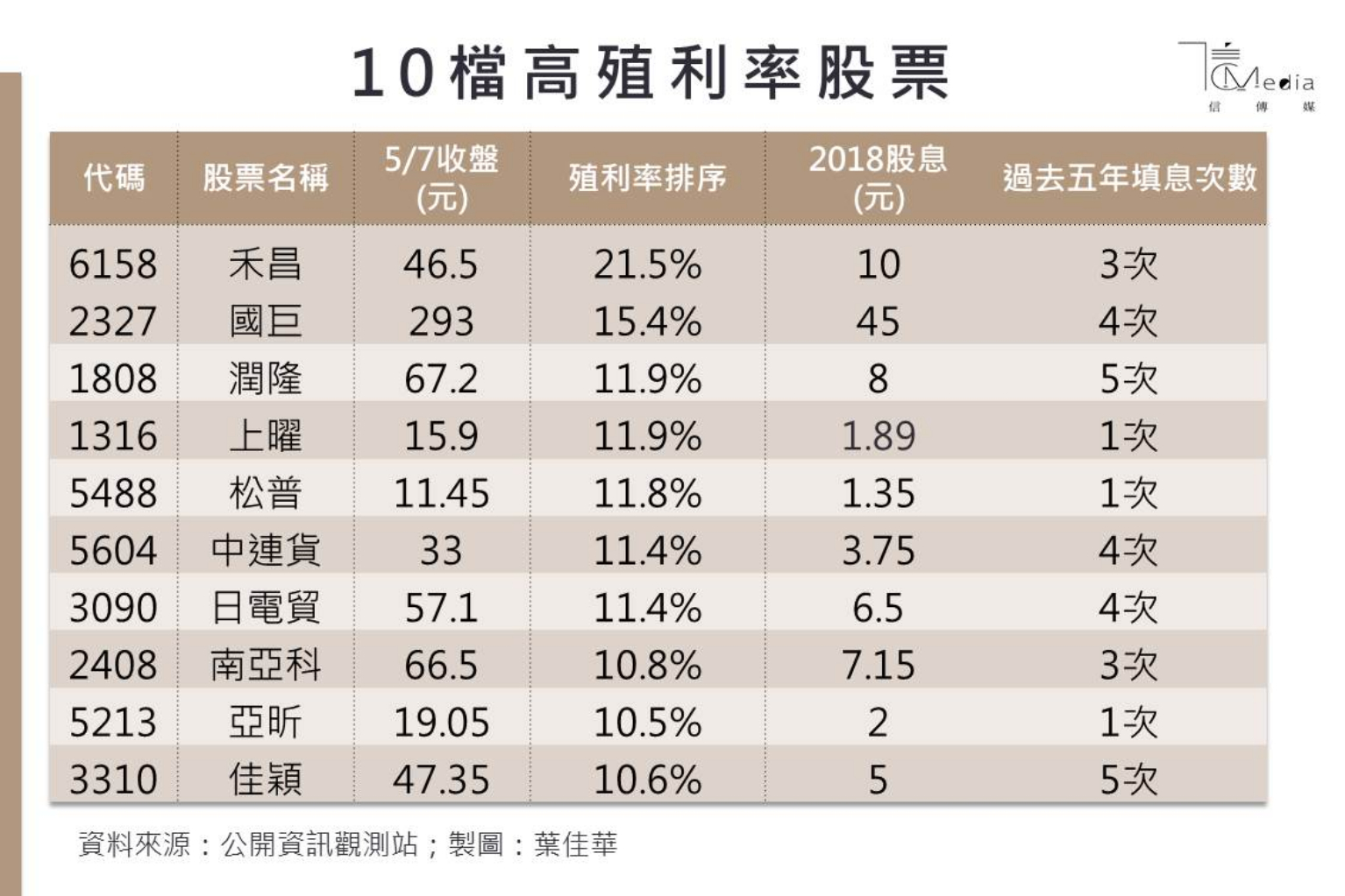 就目前已發布股息的上市櫃公司為例,連接器廠禾昌(6158)宣布擬配息10 元,以5月7日收盤價46.5元計算,等於現金殖利率高達21.5%,列入殖利率排行榜冠軍;其餘9檔個股當中,依序為國巨、潤隆、上曜、松普、中連貨、日電貿、南亞科、亞昕、佳穎等,殖利率皆超過10%。