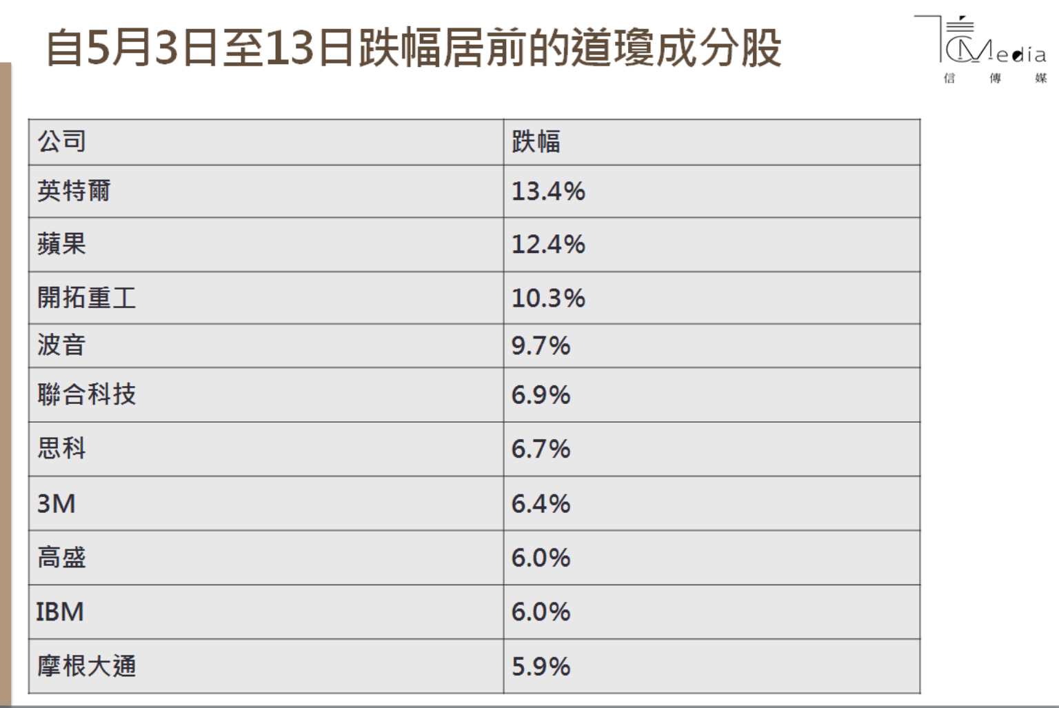 比較依賴中國市場的道瓊成分股跌幅居前,自川普發布推文到13日的6個交易日內,英特爾、蘋果和挖土機製造商開拓重工股價都下跌超過10%。
