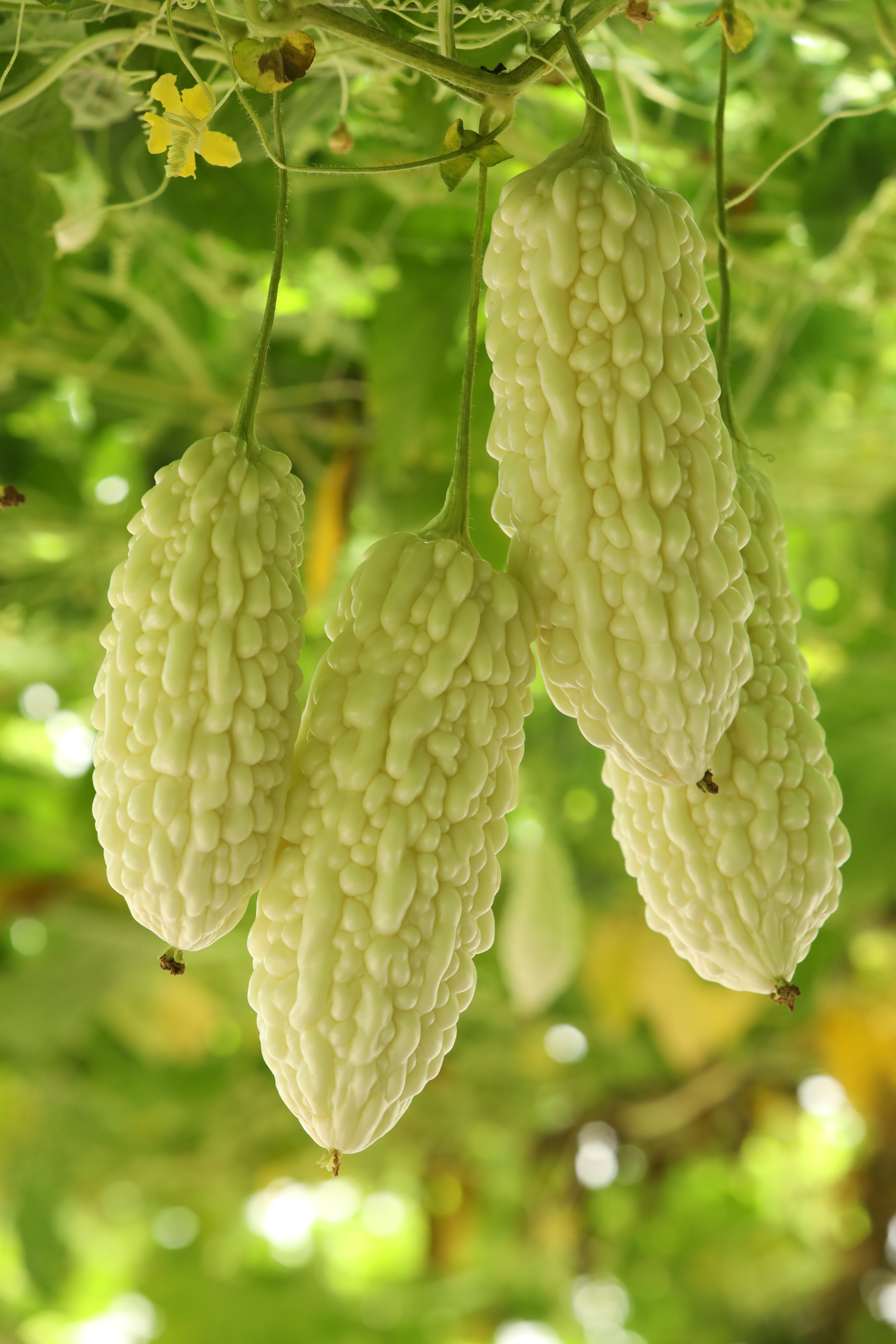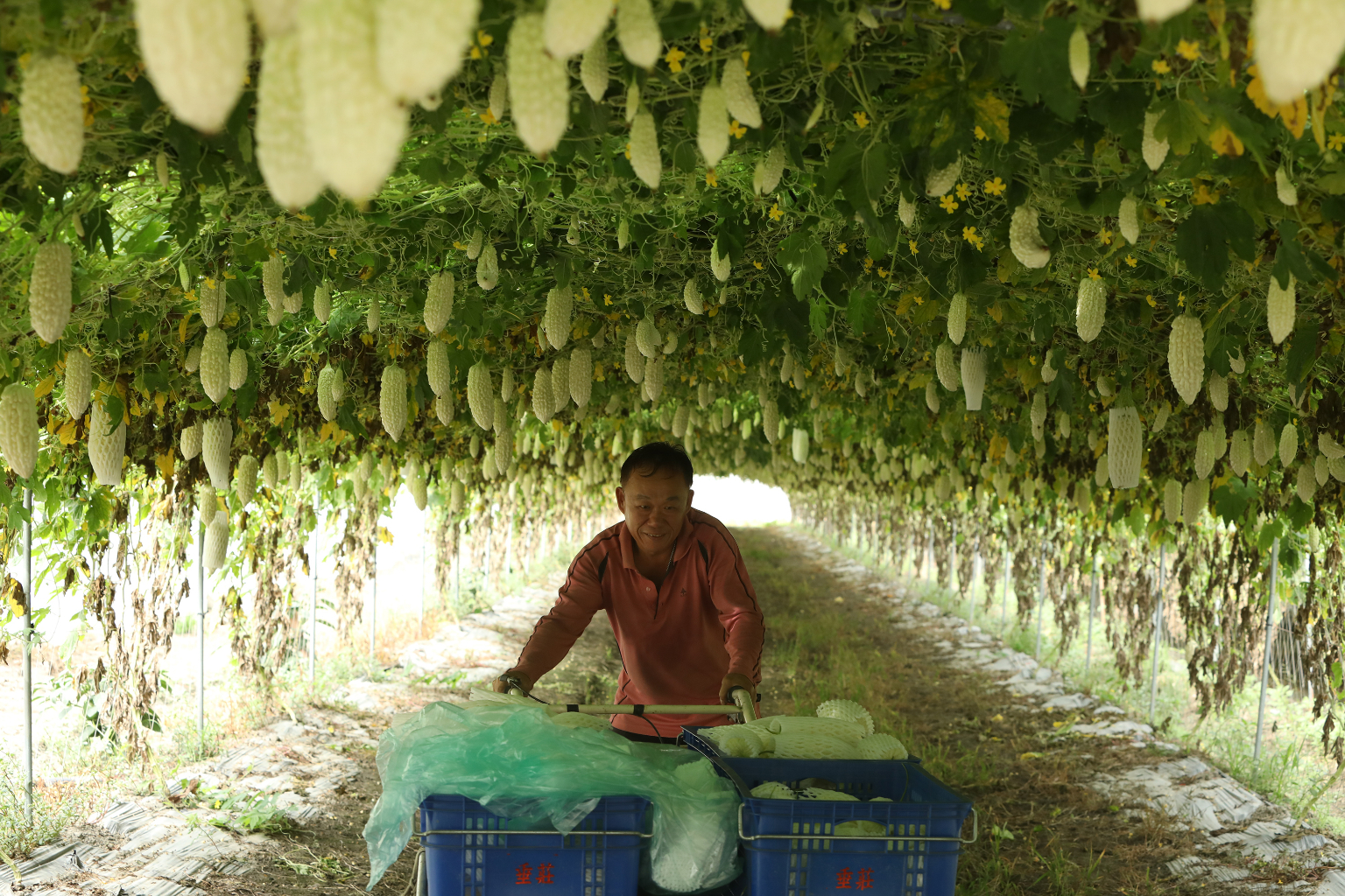 走進南州白玉苦瓜的生產區,一棟棟簡易網室的瓜棚下,嗡嗡嗡的小蜜蜂正在忙著為苦瓜黃色的小花授粉,經過授粉過的花,大約15天就可以成熟,瓜棚裡一早忙碌的除了蜜蜂,還有苦瓜新秀姜德雄夫妻。