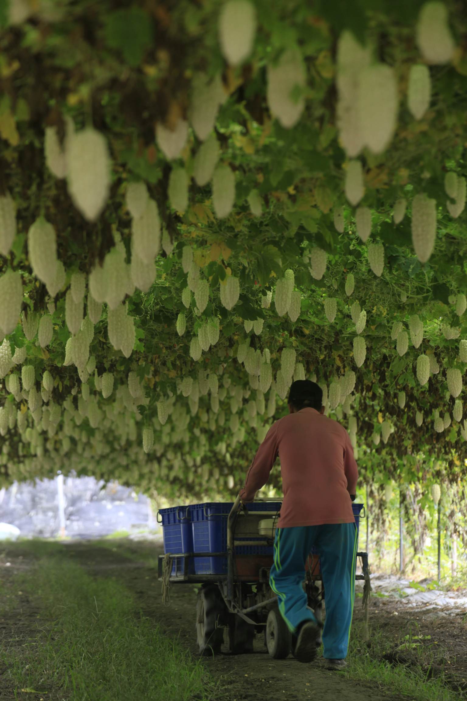 苦瓜一年可以種植兩期,兩年多來他已經種了四期,平均拍賣價不錯,收入不比上班族差,而且時間多了,身體狀況也改善,進到姜德雄的苦瓜園,簡易的網室覆蓋,讓外面的蟲子進不來,網室裡的蜜蜂也不會飛走,成了瓜棚下另一個超級好幫手,是遠從越南嫁給他的老婆。