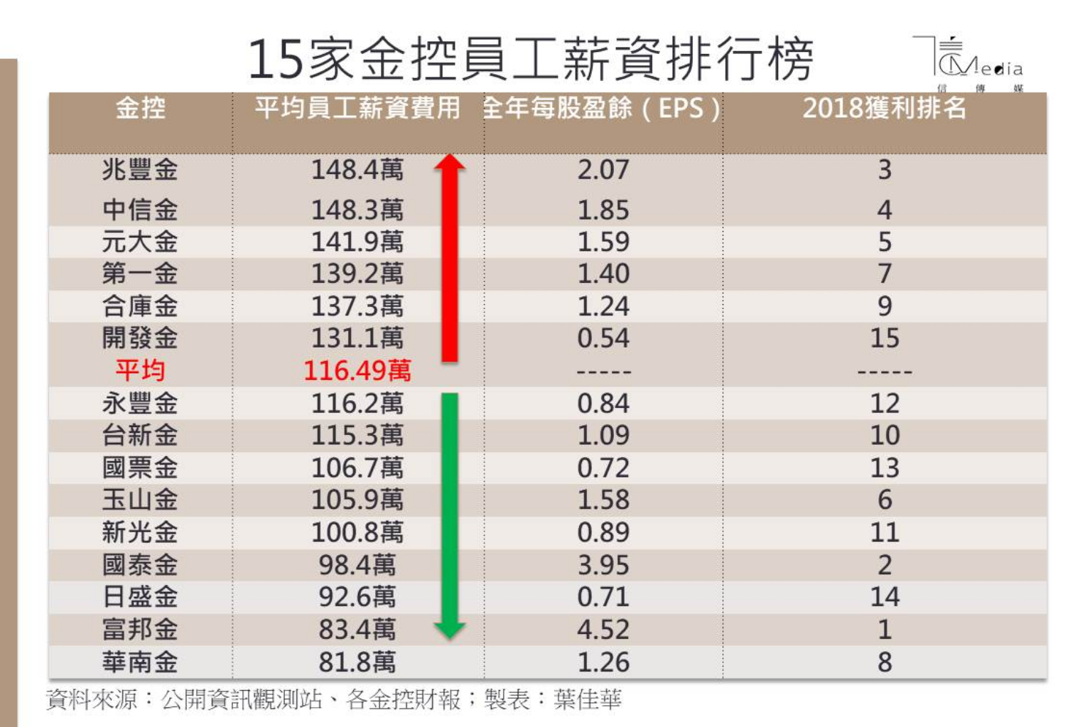 結果顯示,公股行庫龍頭兆豐金去年每股稅後盈餘賺2.07元排名第三,平均員工薪資費用則以148.4萬拿下冠軍寶座;一向是員工薪資績優生的中信金,則以平均148.3萬位於第二名;而去年獲利排名第五的元大金,平均員工薪資也同樣超過140萬,擠進第三名。