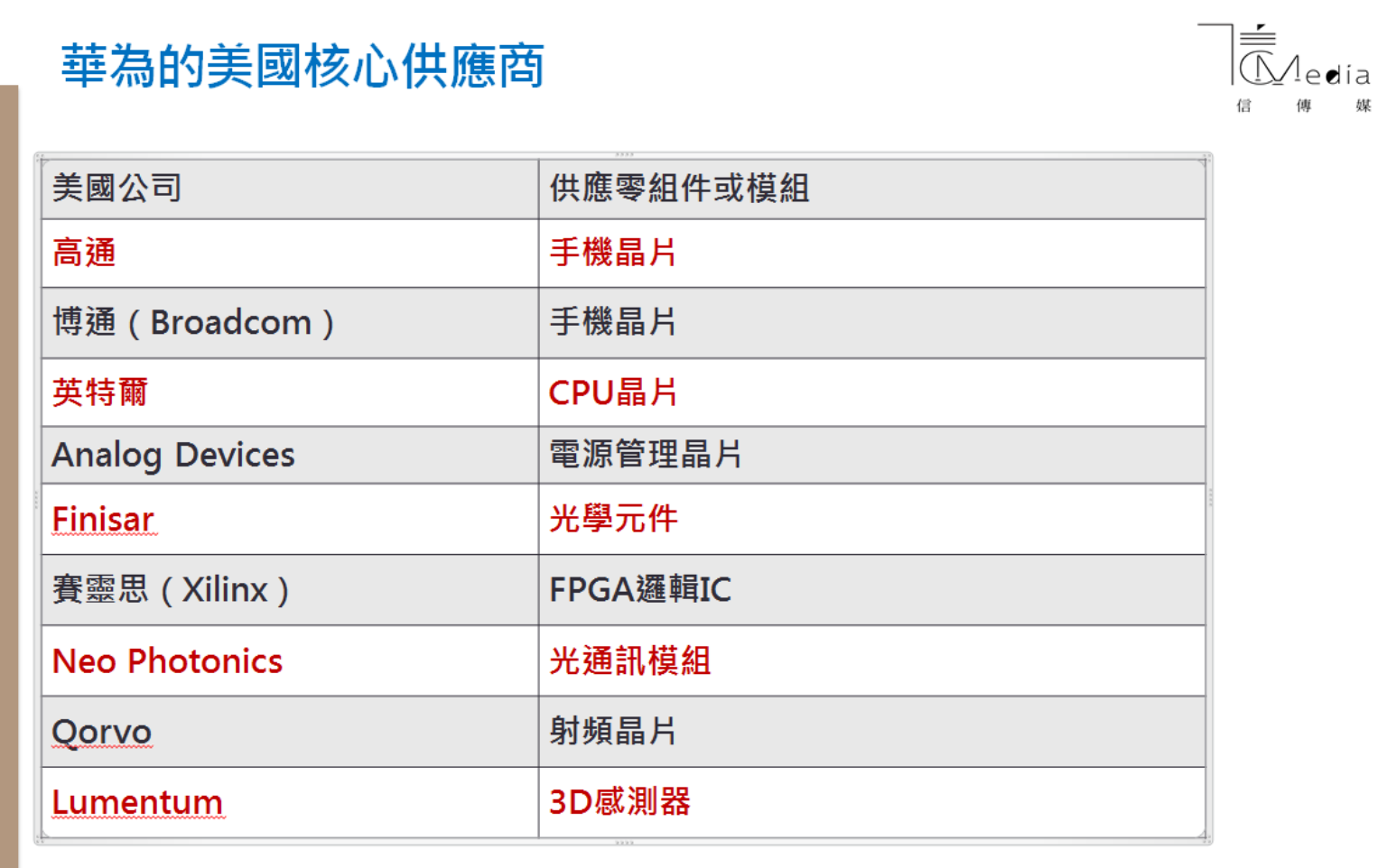 雖然華為是美國的科技禁令目標,直接打擊的企業包括華為與其70家子公司、台灣10多家供應鏈廠商,招來中國政府的嚴正批評,也傷到美國自己的晶片、電子零組件供應商。