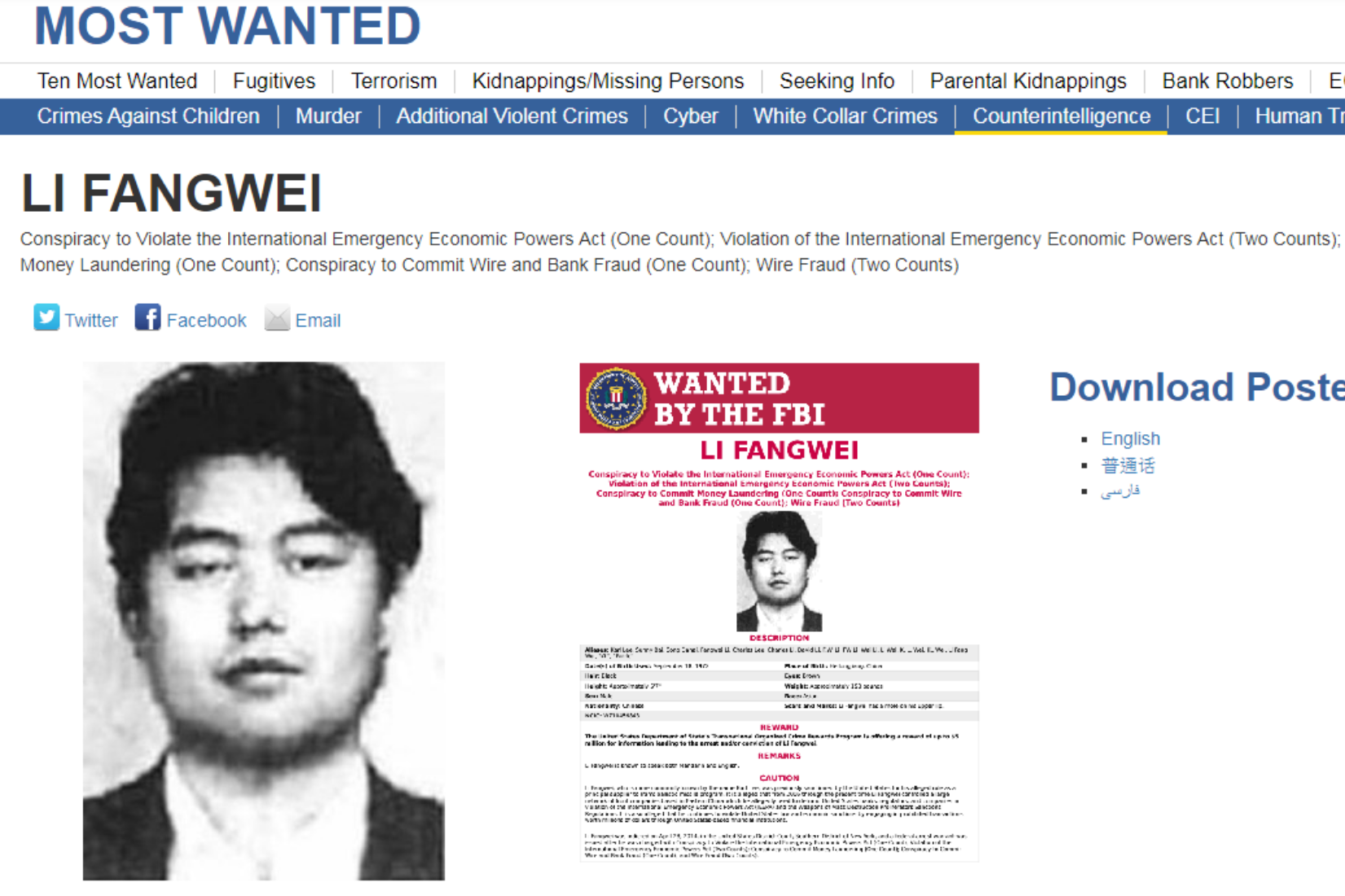 另一人為李方偉(Li Fangwei),他是大連中創碳素股東,因涉嫌利用空殼公司詐騙美國金融機構,並為伊朗彈道導彈的主要供應商,2014年遭美國政府起訴,目前被聯邦調查局(FBI)以懸賞500萬美元(1.6億台幣)通緝當中。