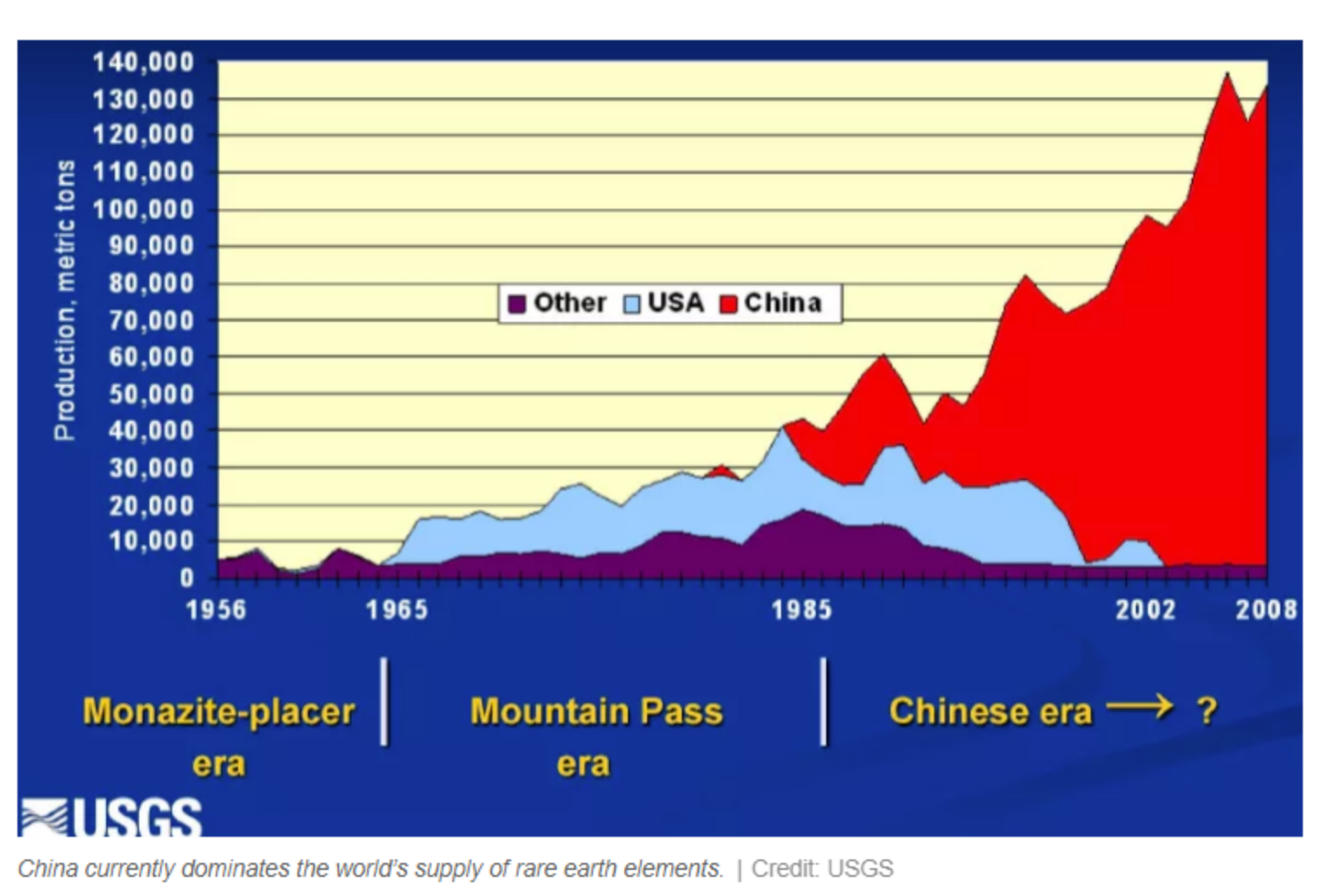 回顧1960年代和1980年代之間,當時世界上大部分的稀土實際上是在美國生產,來自加州的Mountain Pass礦。在處理有毒廢水問題後,該礦場的加工廠於1998年關閉,整個礦區在2002年被封存。