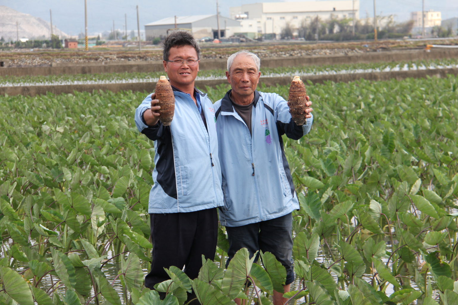 資深芋農陳朝豊(右)為芋頭產銷班班長身兼農業賢拜,將30多年經驗傳承給有志青農,芋農黃至青(左)朝向精緻化生產,曾創下104 年拍賣市場芋頭1公斤140元的最高紀錄,優良品質具產銷履歷已在市場建立口碑。