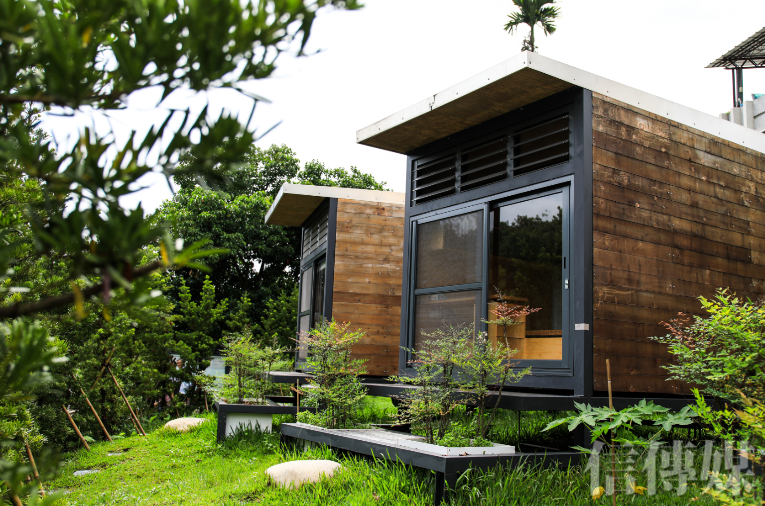 占地約1,300坪共有8棟行動木屋,每棟平均坪數約在13-15坪,雖不算大,卻規劃得宜,由北美紅檜、北美玉杉、不鏽鋼、強化玻璃、鋁門窗、鋁百葉等建材打造,工廠預製3週,現場安裝僅要3小時就能搞定。「原木是我最喜歡的材質,而透過百葉的斜度變化則可調節室內通風,鋼構框架則能阻隔土地濕氣。」