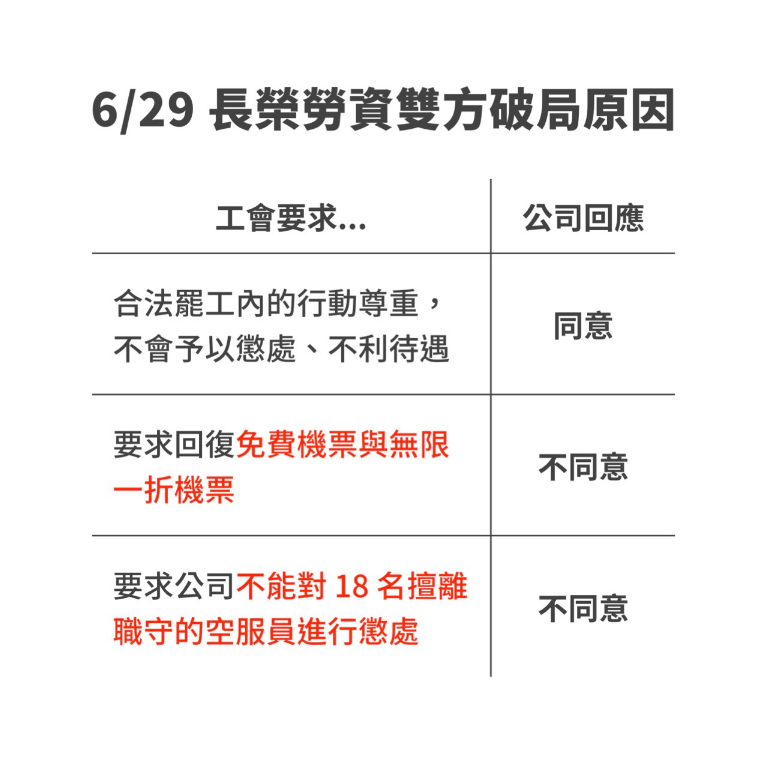工會則回應「繼續罷工」,工會在聲明稿中指出,雙方在「秋後算帳」條款上沒有共識,長榮航空公司當局未提出不秋後算帳的具體方案,而且在工會提出具體方案後並未回應,雙方約定7月2日進行下次協商。