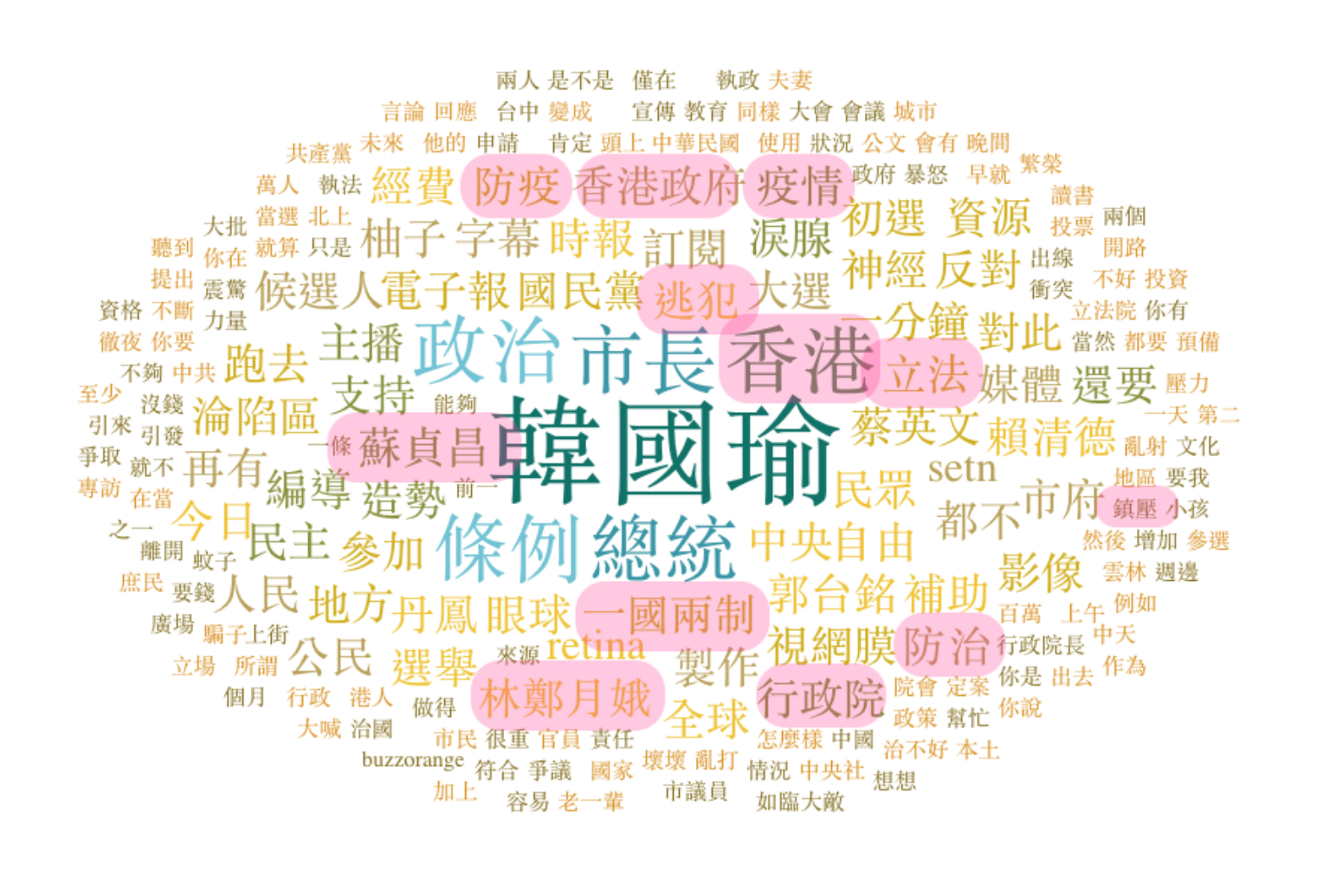 蔡英文粉絲「打韓」的議題,主要來自兩個焦點,包括香港「反送中」事件,以及登革熱防疫。根據思為策略統計,由文字雲來看泛綠社群的討論,支持蔡英文的粉絲專頁,從6月12日至今,充斥著逃犯條例、林鄭月娥、一國兩制等相關辭彙,被拿來類比韓國瑜親中的態度。