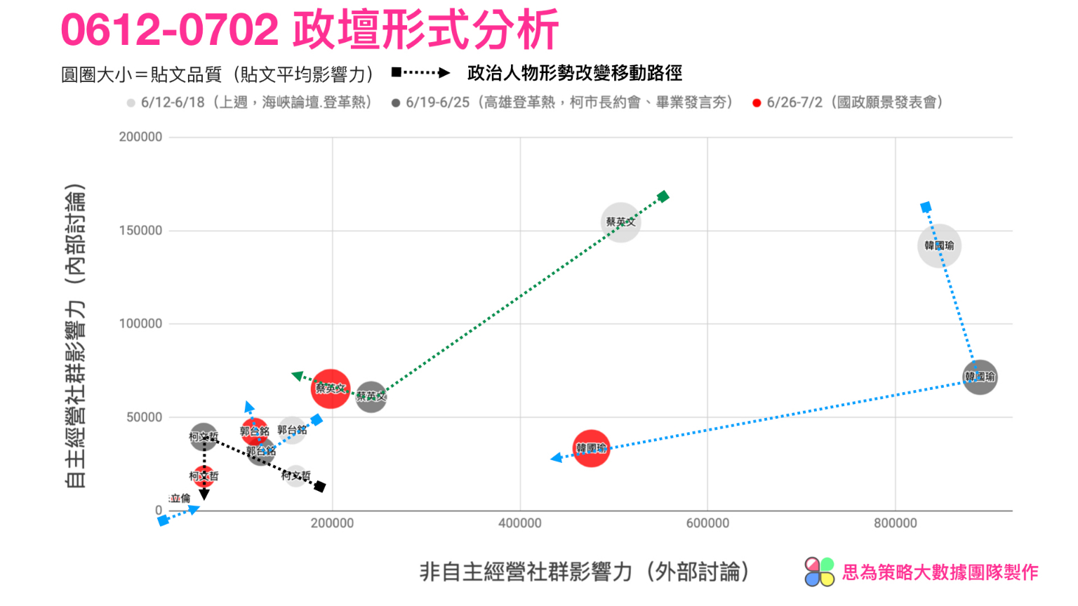 藍綠之外,台北市長柯文哲參選總統的態度仍舊保持模糊,僅能以市政表現維持關注度,然而卻屢屢出現危機,蕭雅云指出,柯粉一方面等待著柯的宣布參選,一方面則討論著其他競爭者蔡柯韓郭的表現,如此到了六月中,柯文哲的聲量已顯疲乏,跌到平常的兩成,甚至近一周的表現,還不敵蔡英文的兩篇貼文,所幸在陽明大學畢業典禮演說、以及上周與夫人陳佩琪造訪屏東、重溫蜜月,用這兩道拿手好菜,才又恢復到原來的水準。