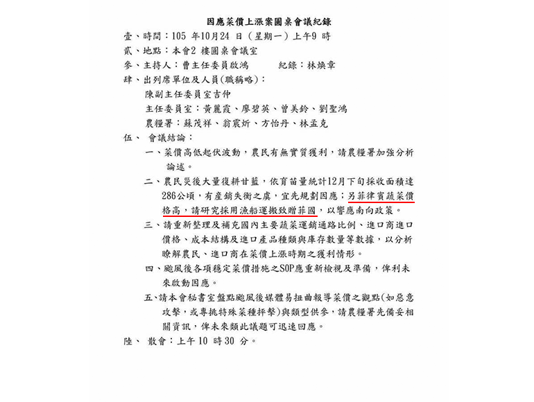 不過,農委會未必知悉「民間玩法」,農糧署在十月底召開「因應菜價上漲圓桌會議」後,將會議記錄發函給各級農政單位要求協助規劃因應,其中提及「因高麗菜有産銷失衡之虞,宜先規劃因應;另菲律賓蔬菜價格高,請研究採用漁船運搬致贈菲國,以響應南向政策。」不過文中並未詳述具體執行方式,讓接獲通知的農政單位難免困惑。