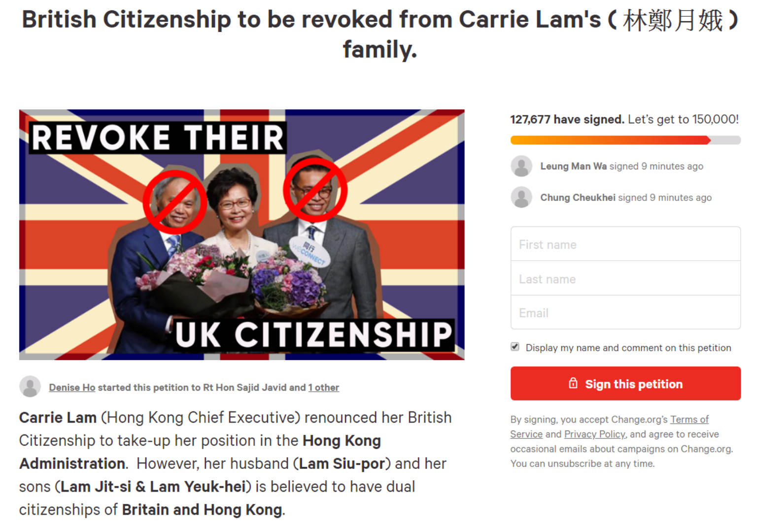 香港示威者視英國為盟友,有民眾發請連署,促請英國政府撤銷香港特首林鄭月娥的丈夫和兒子的英國籍。