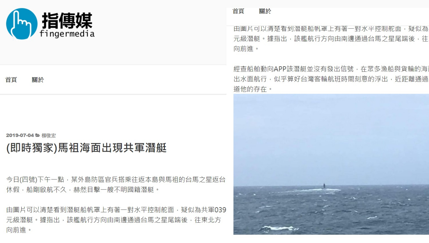 國內《指傳媒》4日報導,一名在馬祖服役的官兵當天下午一點在返台的「台馬之星」船上目擊一艘浮出水面的不明潛艇,被認為是解放軍的039型潛艇。