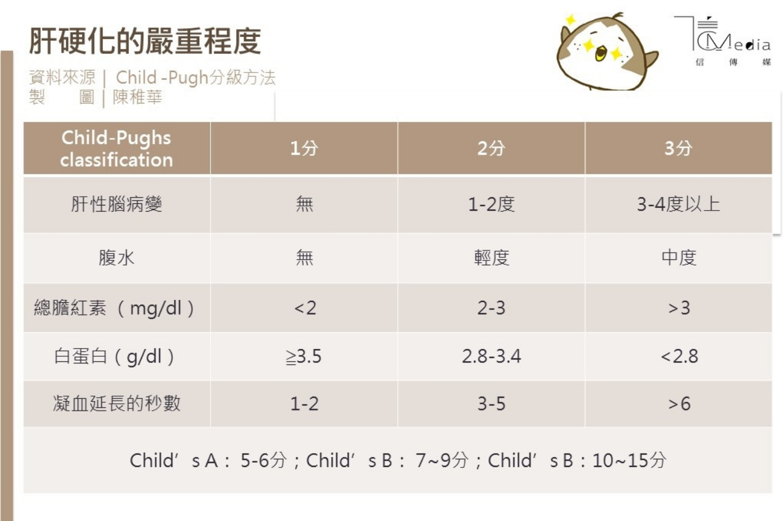 目前國際上把肝硬化的嚴重程度分為3個等級,分數越高表示肝硬化越嚴重;我們列表出來看比較清楚。