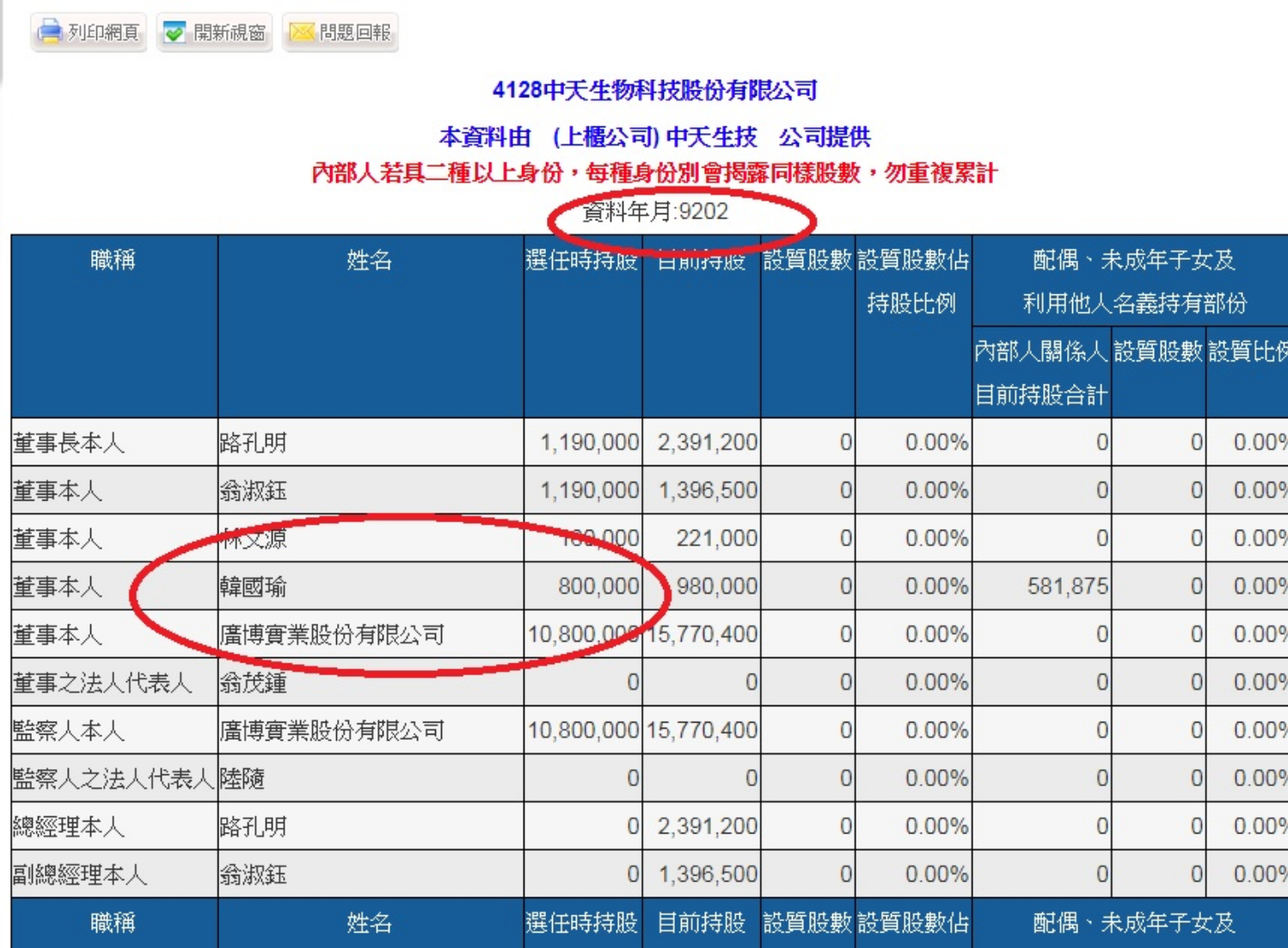 早在民國92年3月,中天生技成立第3年時,韓國瑜持股800張股票,是董事會成員。(圖片來源/ 翻攝自公開資訊觀測站)