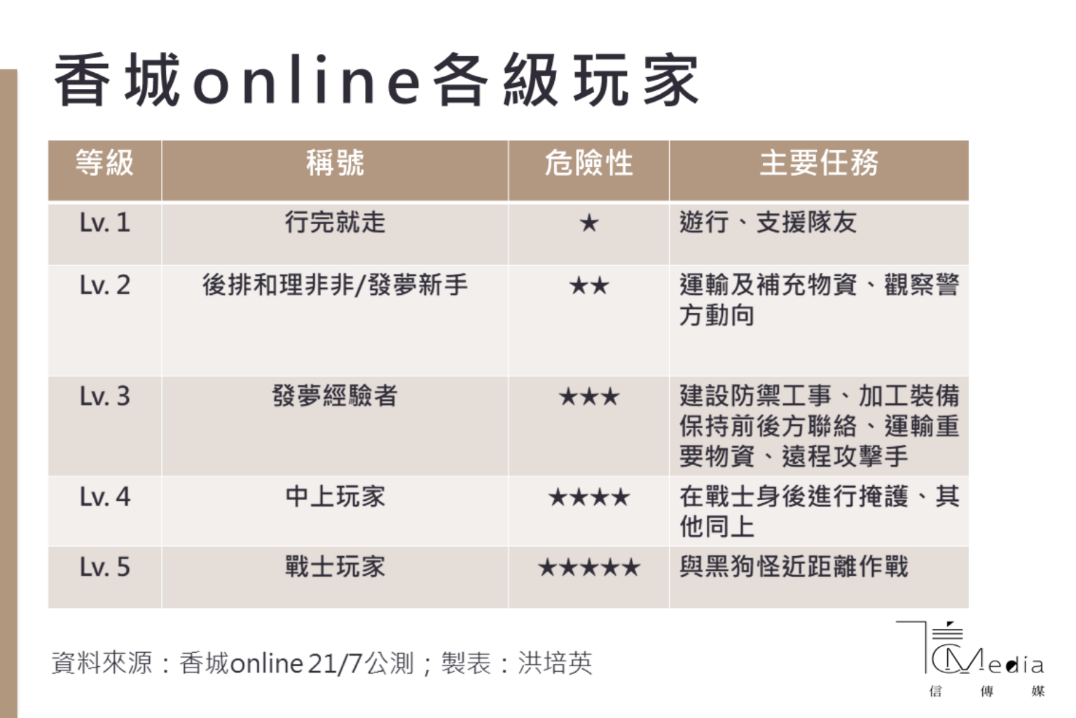 香城online利用「等級」和「職業」為玩家,也就是示威者,做角色分工、組織行動。