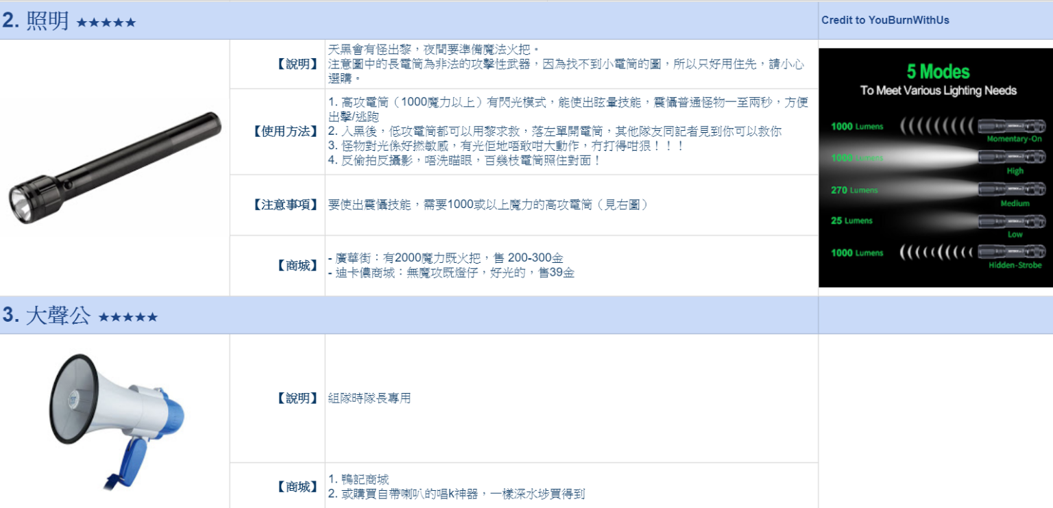 其他有趣的推薦物品還有,塗在身上讓對手抓不到的「凡士林」、龍蛋(催淚彈)收集器「烤肉夾」、振奮軍心的「寶礦力水得」以及魔法火把「手電筒」,既能用來求救,又能防偷拍蒐證甚至使敵人僵直暈眩,拖延對方行動。