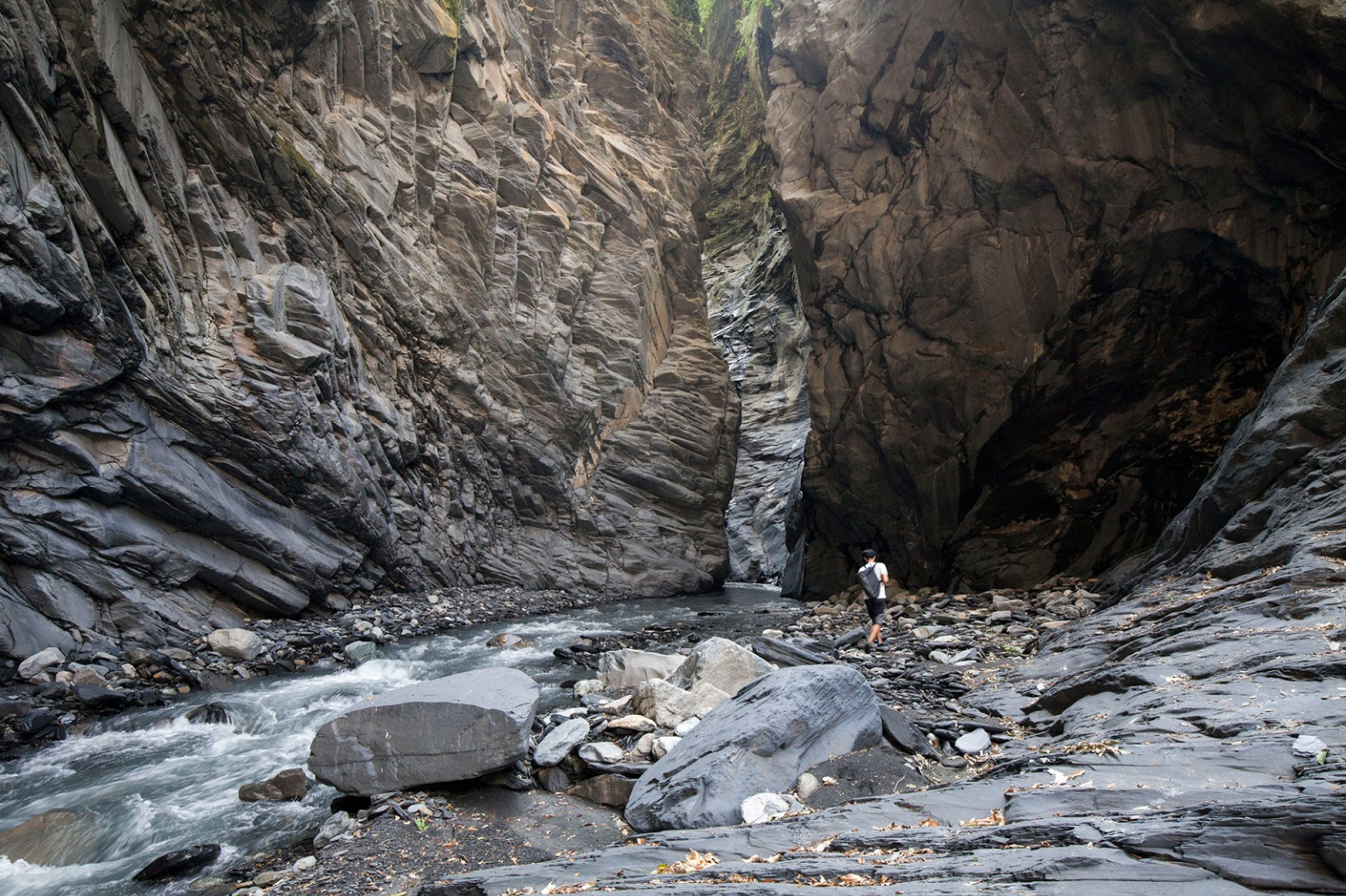 也有很多人選擇用菜瓜布防滑鞋底行走,但是菜瓜布容易夾帶水中生物或蝸牛的卵,會坡壞溪邊生態,從下游攜帶至上游影響環境。平時我還會帶救生衣,特別是不小心摔傷的話還有救身衣可以擋,相機則是用Canon-5D2還備有防水袋放機子,總結就是相機、安全帽、橡膠鞋、救生衣、防水袋等五個品項。我最近想寫一個旅程讓大家都可以前往,所以更不能帶太多多餘的東西,減少行李才能走得更遠。」