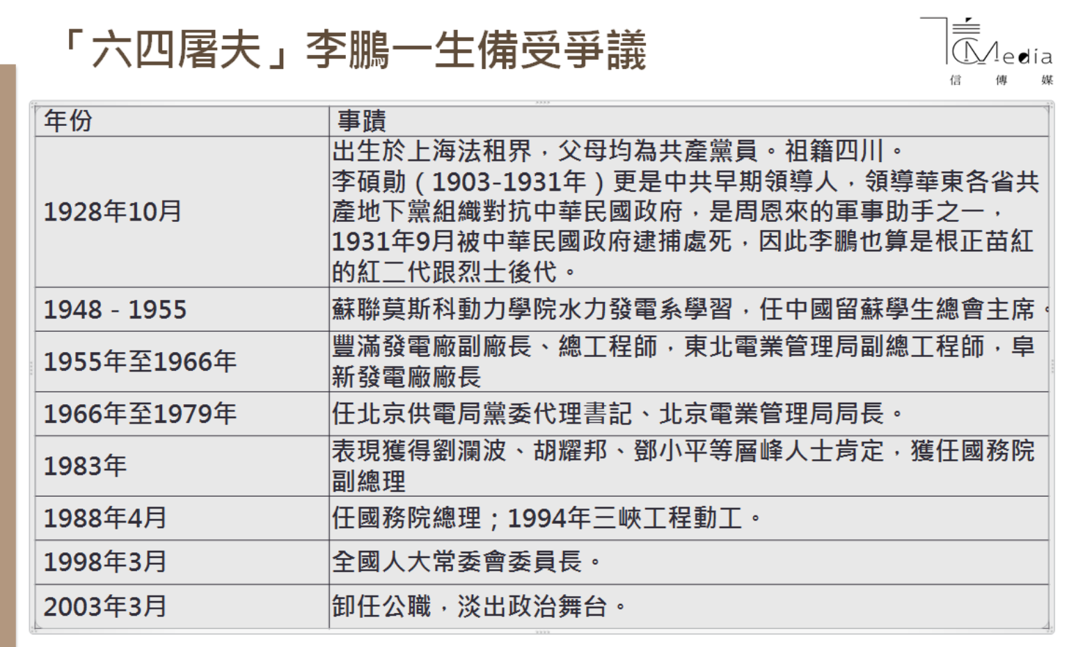 享壽91歲的李鵬一生因為六四鎮壓,三峽大壩和家族成員被指以權謀私等事件,成為爭議人物,更是因為他犧牲六四萬名學子的生命,換來李鵬的子女李小鵬、李小琳當高官和高管。2013年李小鵬擔任山西省省長,2016年由山西省省長轉任交通運輸部部長,而李小琳有「電力一姊」之稱號;她曾任澳門電力董事、中國電力國際發展有限公司董事長等職務。