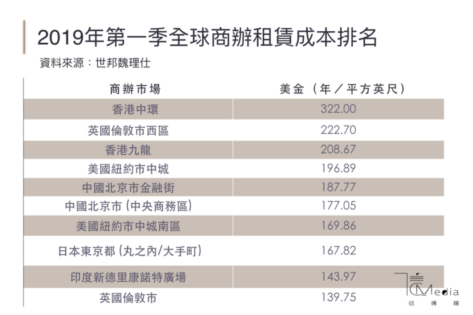 CBRE 世邦魏理仕25日發佈2019年第一季《全球頂級辦公室租賃成本》研究報告,其中不出所料的全球最貴商辦再度由香港中環包下,擊敗英國倫敦、美國紐約、中國北京、日本東京。