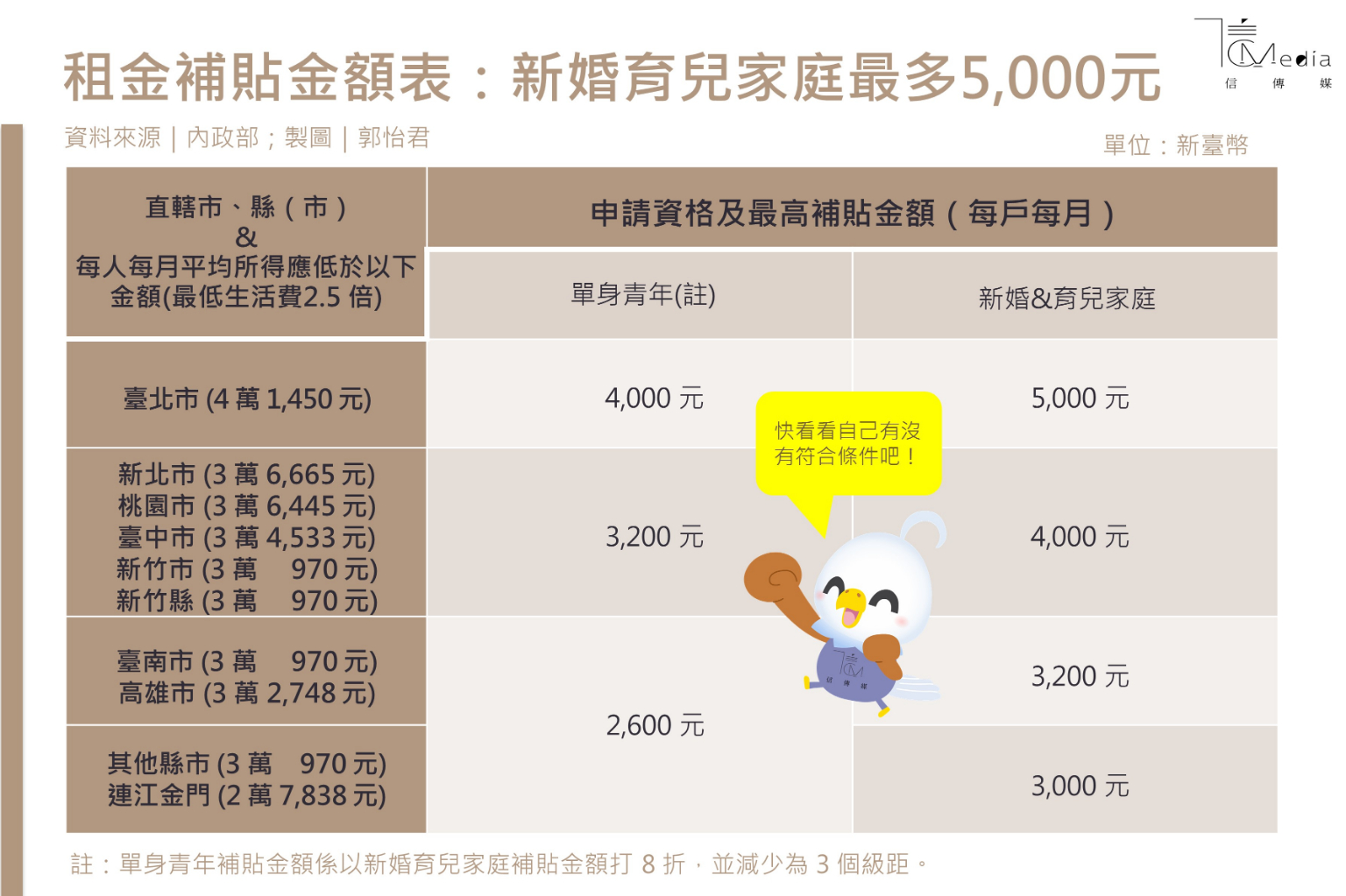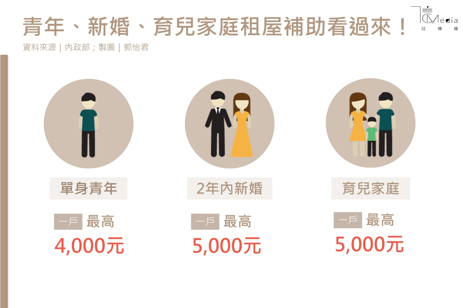 租屋族的小確幸來囉!為讓單身青年可打拼、敢婚、敢生敢養,內政部提報「協助單身及鼓勵婚育租金補貼試辦方案」,今年9月開始受理申請,單身青年每戶每月最高補助4,000元,新婚育兒家庭每月每戶最高補助5,000元,內政部估將有2.4萬戶受惠,試辦期為一年。