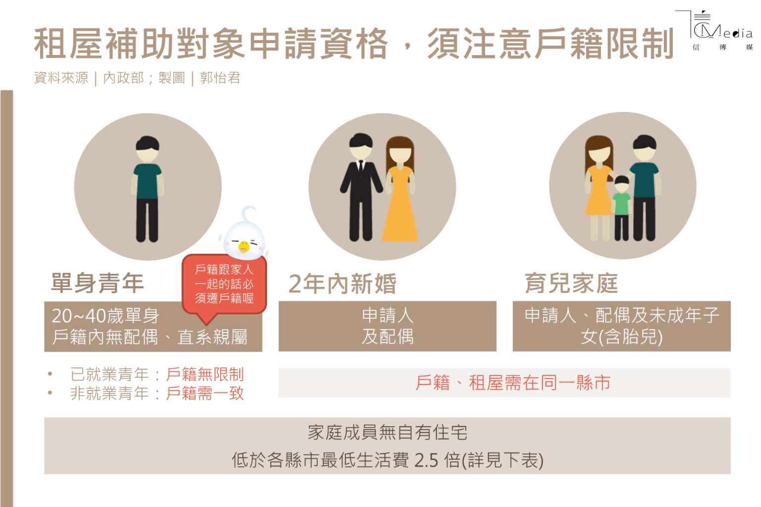 已就業青年之戶籍沒有限制要與租屋地區相同,但要特別注意,戶籍內不能有配偶、以及直系親屬,亦即跟家人同戶籍者,必須要遷戶籍。