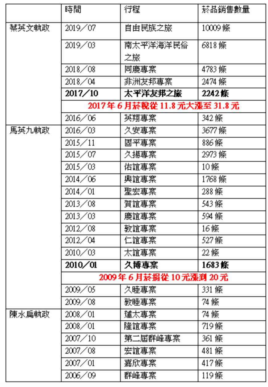 根據菸捐、菸稅調漲的脈絡來看,2009年6月菸捐從10元漲到20元,隔天馬英九出訪的「久博專案」所訂購的香菸就從前一次的3百多條增加到破千條;再來,2017年6月菸稅調高至31.8元,同年10月蔡英文的「太平洋友邦之旅」也一口氣暴增到2242條,甚至是隔年的「同慶專案」更是飆到4783條,且情況持續增長。