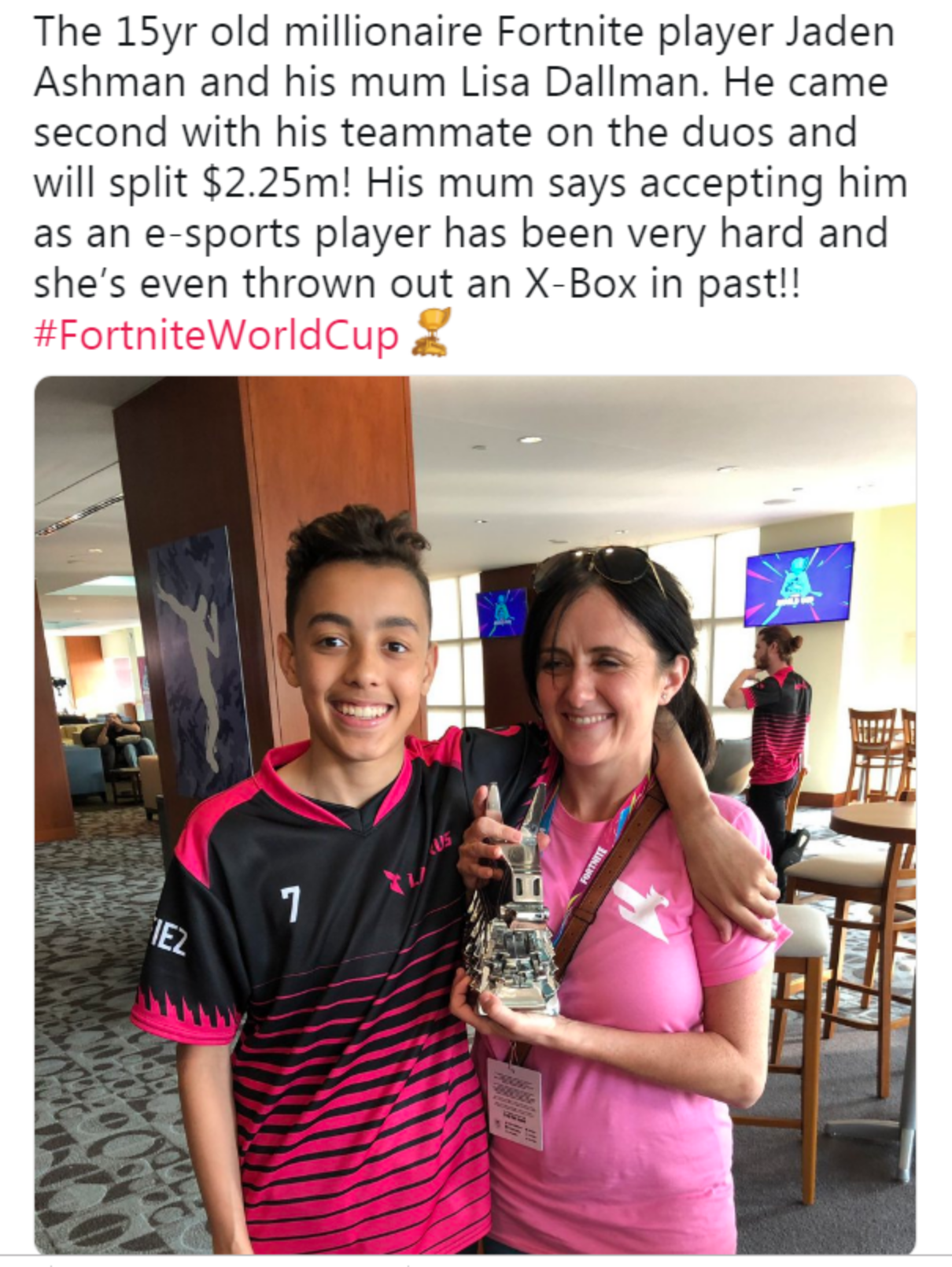在電玩《要塞英雄》(Fortnite)世界大賽的決賽當中,一名英國青少年與隊友勇奪雙人組的亞軍,平均一人將分到近百萬英鎊的獎金。