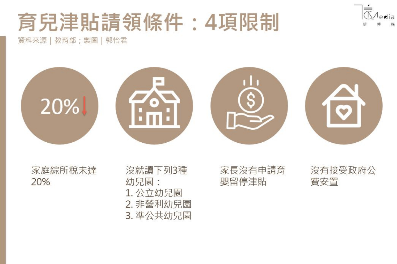 教育部銜接衛福部育兒津貼,預計從8月1日起開放申請,只要家庭綜所稅未達20%、無育嬰津貼、無公費安置者,每童每月可領2500元,且將與衛福部取得資料,已請領未中斷者將自動發放,一路領到4歲。