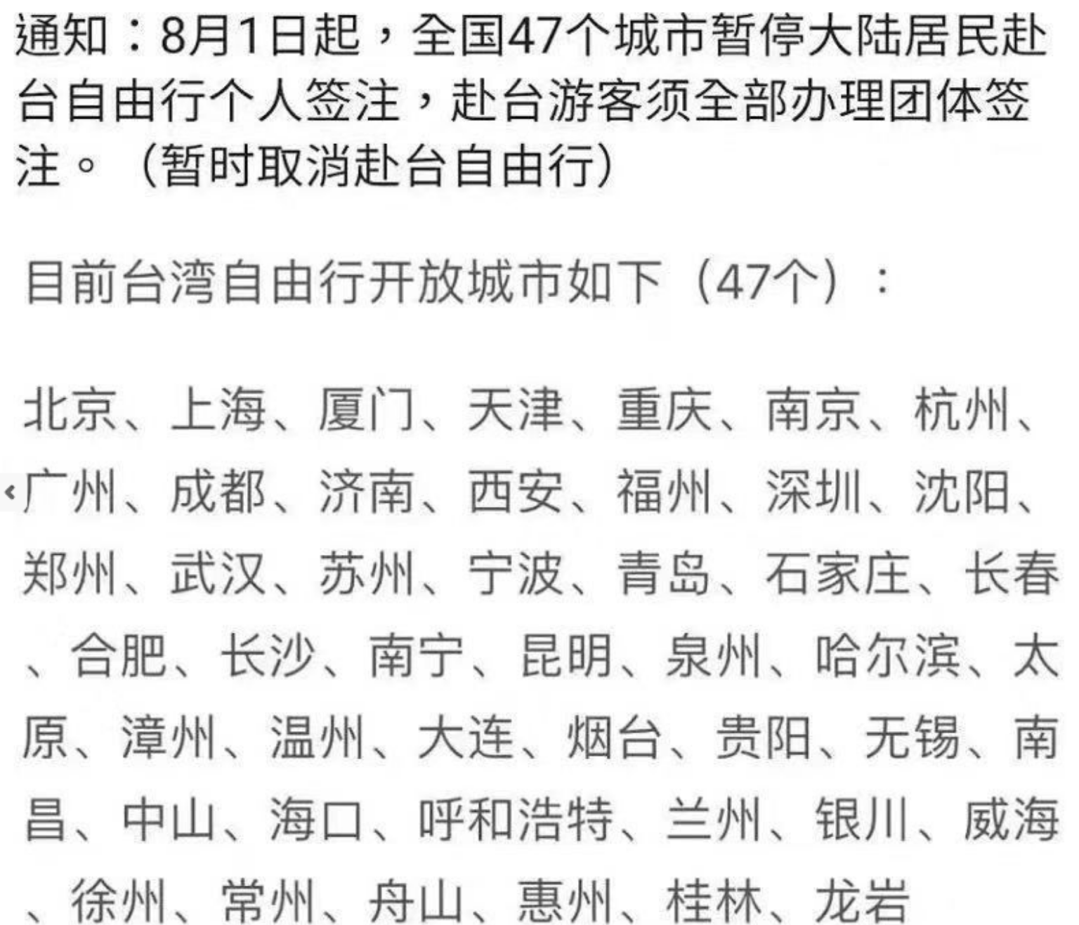 根據中國文化和旅遊部網站消息,鑒於當前兩岸關係,決定自2019年8月1日起暫停47個城市大陸居民赴台個人遊試點。