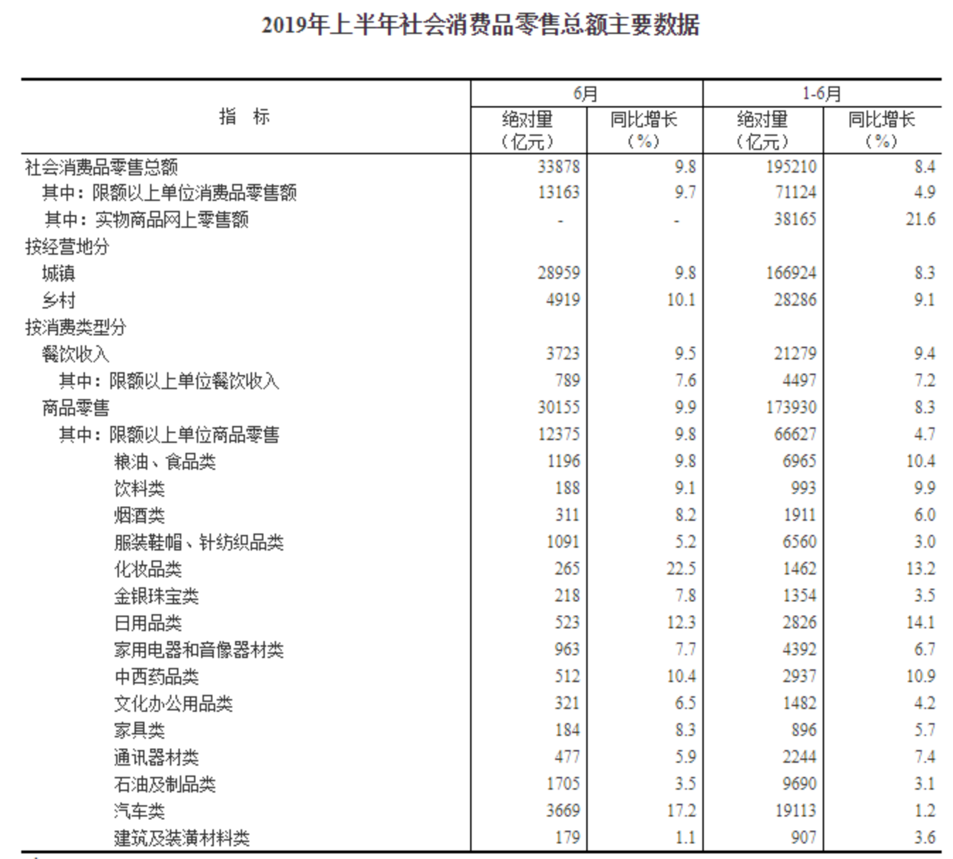 中國6月份中國零售銷售年比大幅增長9.8%,創15個月新高,高於5月的8.6%和上半年的8.4%,主要是因為更嚴格的國家VI排放標準在7月1日生效以前,汽車售價大幅降價,刺激6月汽車銷售成長17.2%。