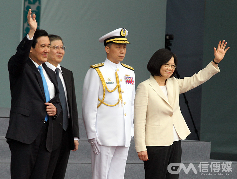 蔡英文總統(右)陪同即將離開總統府的馬英九前總統(左),做最後的揮別。(攝影/林旻萱)