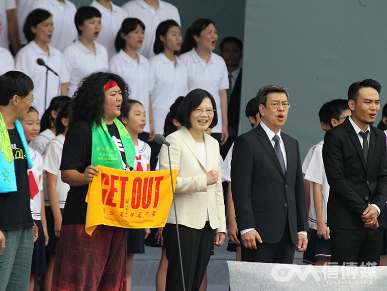 總統蔡英文(左三)、副總統陳建仁(右二)與民眾一起合唱「美麗島」後就職慶祝大會圓滿結束。(攝影/林旻萱)
