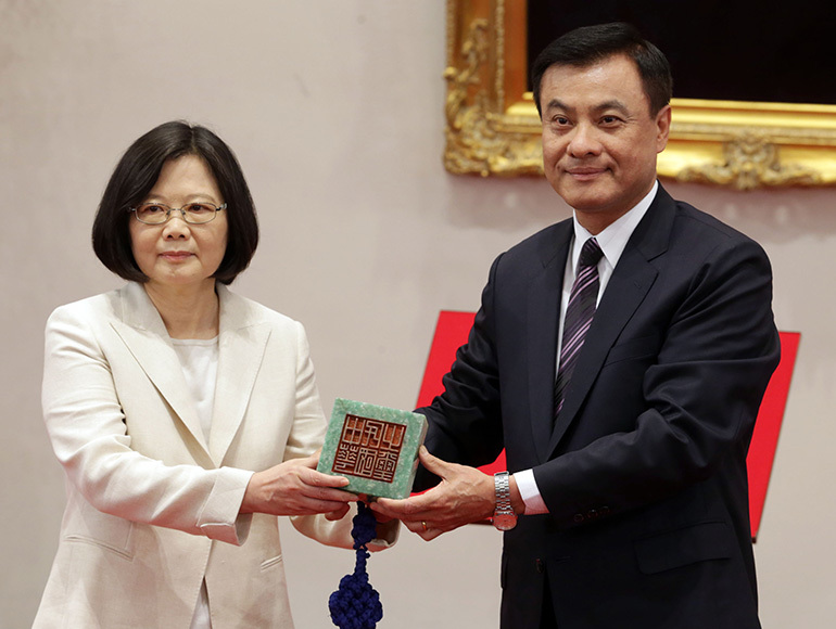 宣誓結束後由立法院長蘇嘉全(右)授與總統蔡英文(左)中華民國之璽。(台北市攝影記者聯誼會提供)