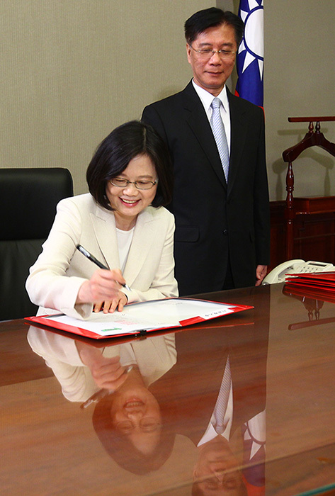 總統蔡英文於總統辦公室內簽署人事任命公文。(台北市攝影記者聯誼會提供)