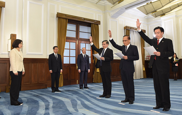 由總統蔡英文(左一)監誓國安會秘書長吳釗燮(右一)、行政院長林全(右二)、總統府秘書長林碧炤(右三)宣誓就職。(台北市攝影記者聯誼會提供)