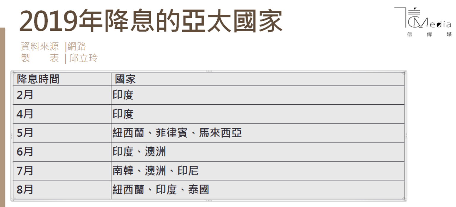 其中,印度央行7日宣布附買回利率調降35個基點至5.4%,創2010年來新低,以刺激放緩的經濟。央行同時將2019年度(今年4月起)經濟增長預估從6月預估的7%調降至6.9%。今年第一季GDP僅增長5.8%,創5年最慢速度,為印度央行今年4次降息的主因。