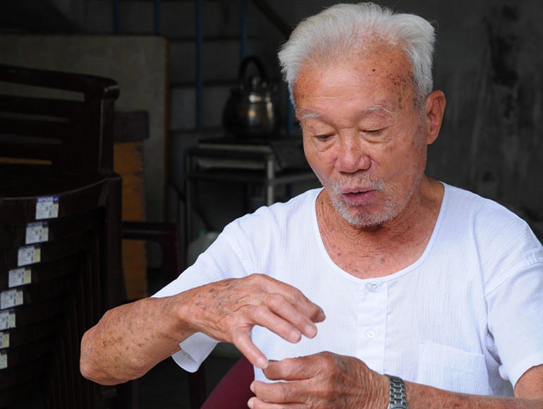 百千爺爺回憶小時候手做陀螺與同伴較量的場景。(攝影/陳淑文)