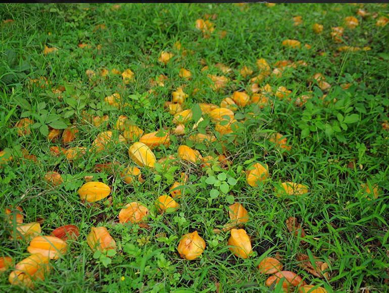 外皮熟黃的楊桃,一片金黃的舖躺在樹下。(攝影/陳淑文)