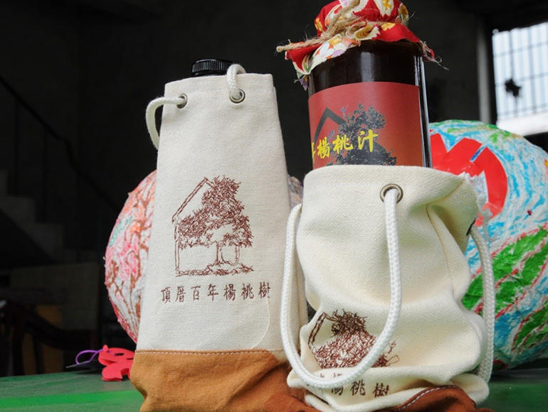 社區將做好的楊桃汁以玻璃瓶分裝,還以手工做了包裝布袋,而包裝袋則以林園在地產的洋蔥外殼熬煮染色,並以車繡標記「頂厝百年楊桃樹」,成為特色伴手禮。這樣的懷舊手工,展現對存在百年的楊桃樹之心意,也留存了地方的記憶。