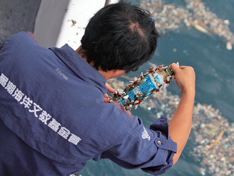 人為廢棄物對海洋造成的影響,當然不只是這樣。我在海邊撿垃圾時,偶爾也會碰到擱淺的鯨豚或死亡的海龜、海鳥。這些死亡動物經過解剖之後,多半會發現胃袋裡除了正常的食物殘渣之外,或多或少都還留有塑膠袋、塑膠碎片、瓶蓋、打火機碎片等廢棄物。在2001年利奇馬颱風過後,我們就曾經在嘉義東石海邊一隻擱淺死亡的瓶鼻海豚胃袋裡,發現了糖果、餅乾的包裝袋,以及一件沒開封過的輕便雨衣;後來陸續傳出一些研究消息,人為垃圾對海洋生物的影響,不僅僅是停留在表層水面,中研院的學者甚至在生活於數百公尺深的深海魚肚子裡面,也發現了塑膠袋和塑膠碎片。