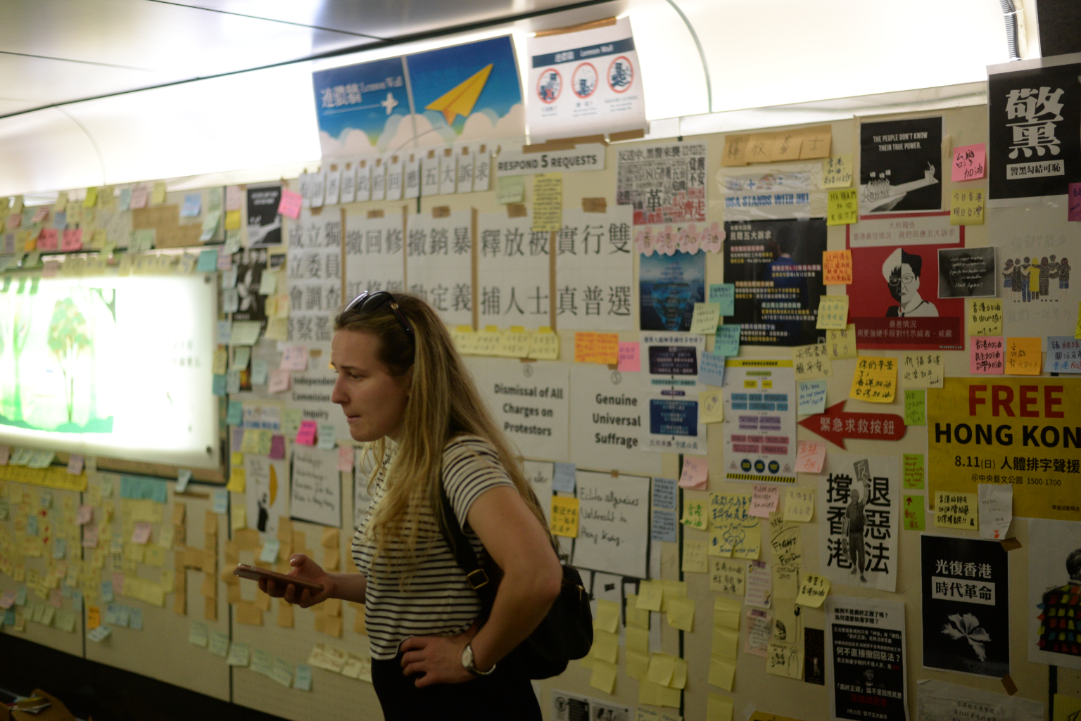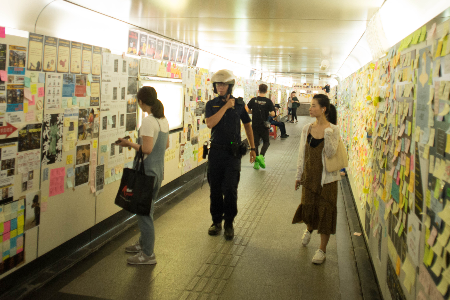夏天的地下道相當悶熱,然而不少人仍受五彩繽紛的連儂牆吸引,駐足細看一張張聲援香港的海報及便利貼,與其他人輕聲討論,或者提筆寫下自己的留言。