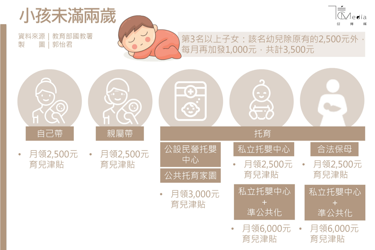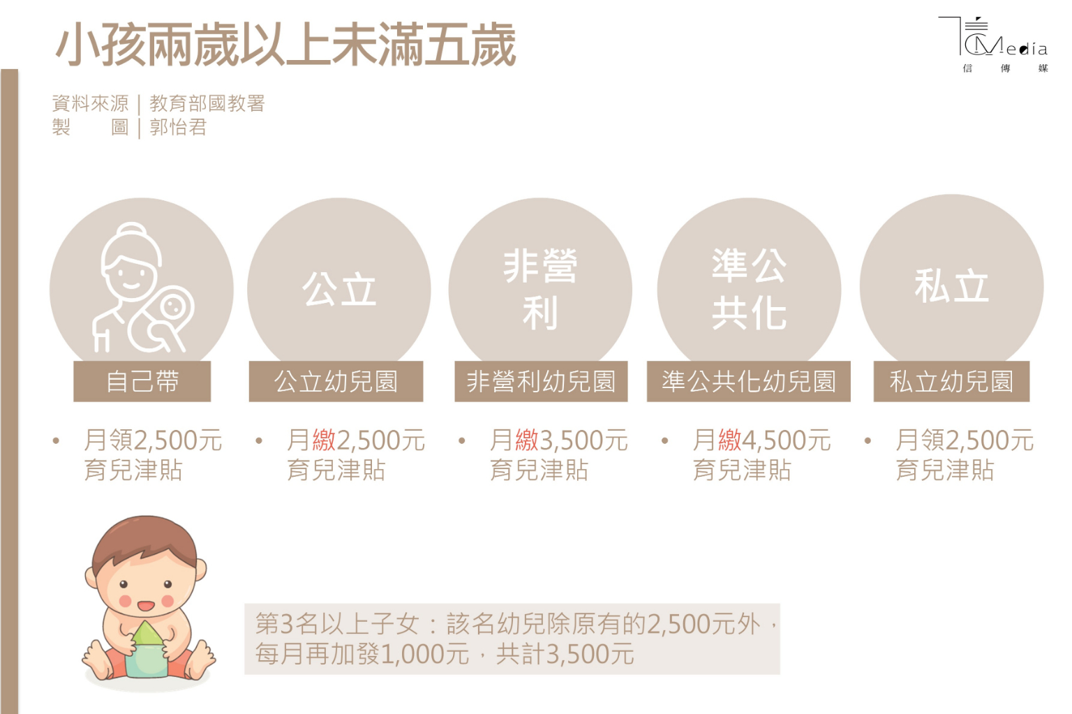 育兒津貼發放對象是2歲到未滿5歲,家庭綜合所得稅率未達20%、且未就讀公幼、非營利幼兒園及準公共化幼兒園、也未領取育嬰留職停薪者。