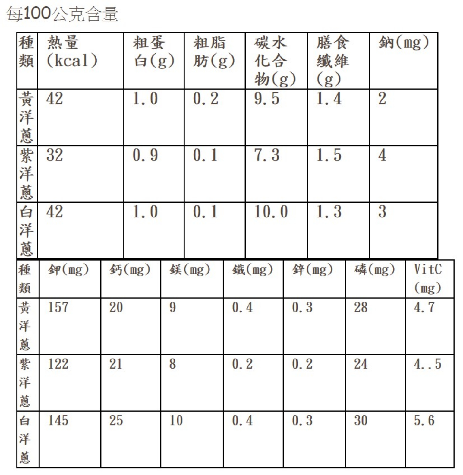 洋蔥含纖維、鈣、鉀、鐵、維生素C、硫化物、類黃酮(槲皮素)。其中內含的硫化物以及類黃酮物質已有許多研究證實對於體內抗氧化反應以及心血管、血脂有保護作用。