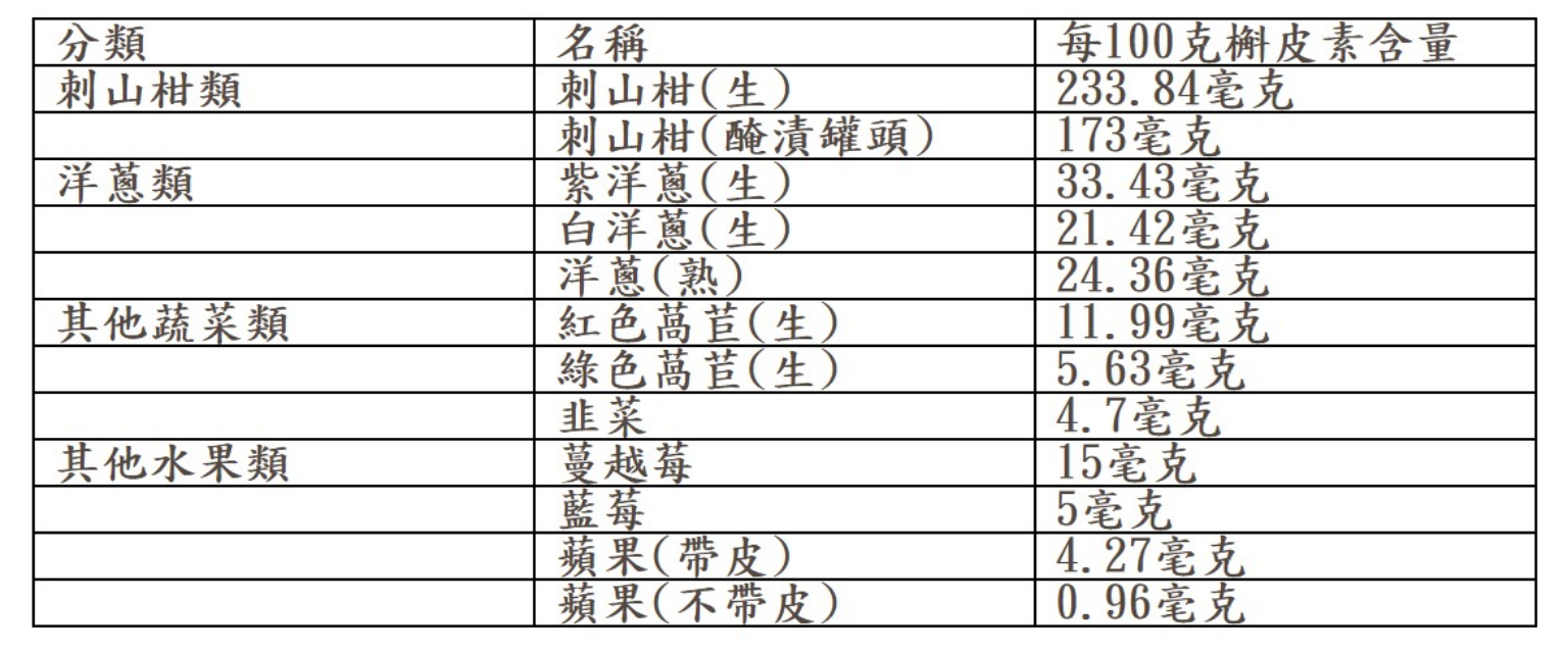 食物中槲皮素的常見來源及含量多寡。(圖片來源/彰基提供)