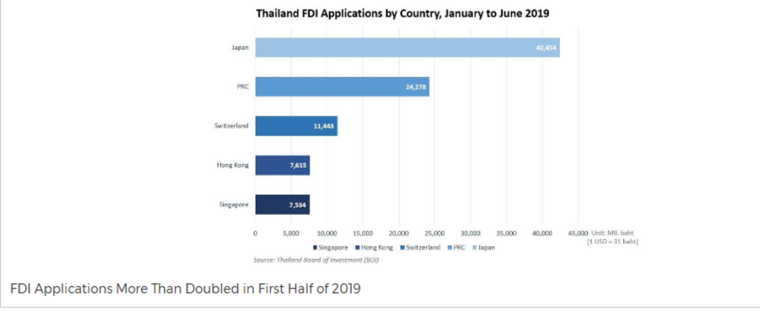泰國投資局(BOI)表示,從FDI來源國家來看,在整體468個項目中,日本公司長期以來一直是泰國FDI的最大來源國,上半年又以申請114個投資項目奪得第一,總額為424.5億泰銖(432億台幣),其次是中國的81個項目總投資額242.8億泰銖(247億台幣),瑞士申請10個項目總投資114.4億泰銖(116.3億台幣)。