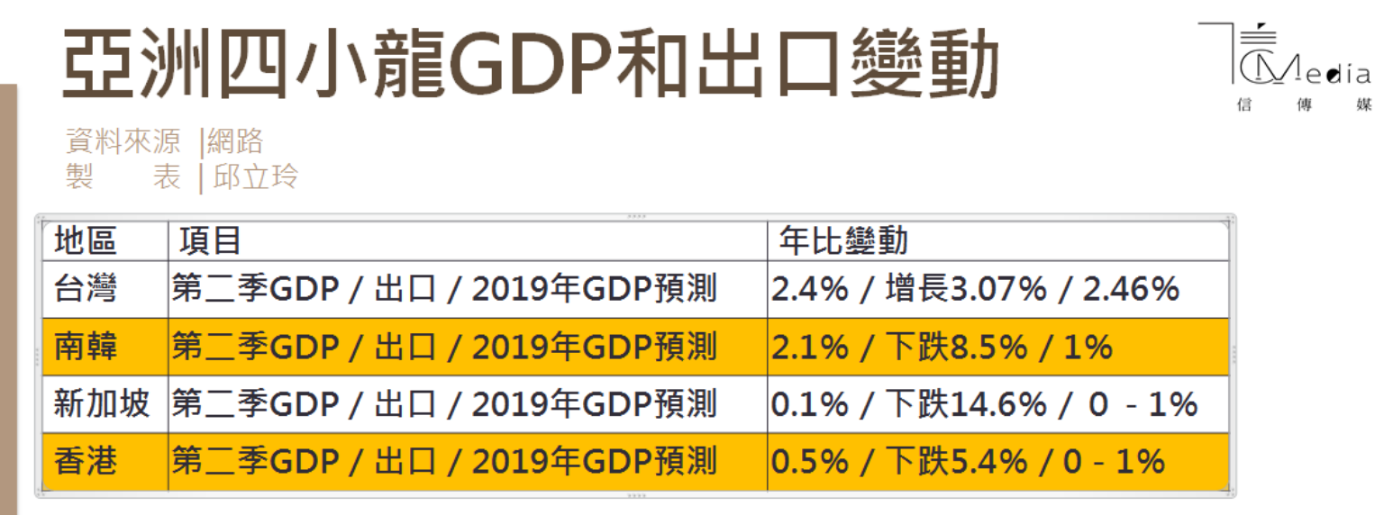 研究機構IHS Markit在今年五月預測2019年亞洲四小龍經濟成長率以台灣2.0%最高,香港1.8%、南韓1.7%、新加坡1.4%,IHS Markit在8月公布以上半年數據做出的最新2019年全年預測,台灣仍是四小龍之首,台韓港星四國GDP增長率分別是2.0%、1.4%、0.7%、0.6%。