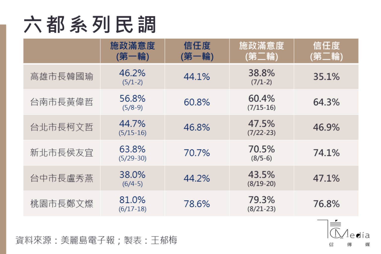 距離去年底各縣市首長上任,剛滿8個月,《美麗島電子報》26日發佈「2019年8月桃園市民調」,內容同時也整理出了7月到8月陸續公布的六都市長施政滿意度和信任度排行。