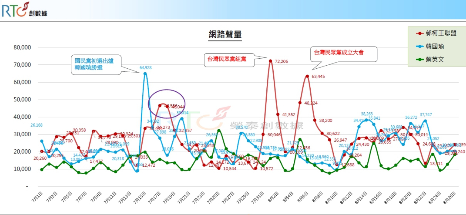 《榮泰創數據》指出,7月中韓國瑜代表國民黨參選2020總統開始,第三勢力的形成成了各方關注的焦點,不論柯文哲組民眾黨的意圖,或是郭台銘、王金平的動向,都牽引著選情,8月份郭王柯聯盟的總聲量,儼然已經超越韓國瑜。